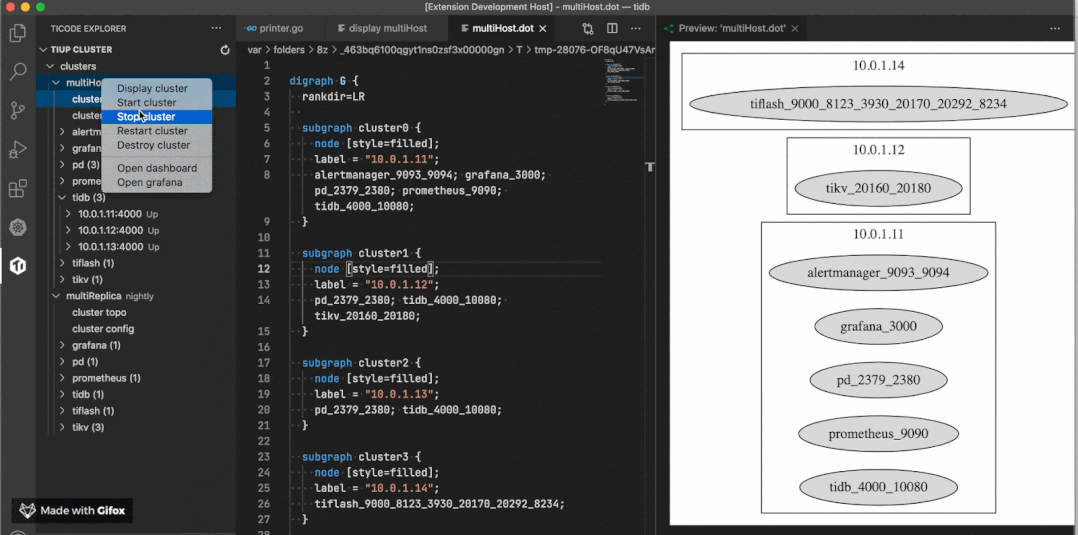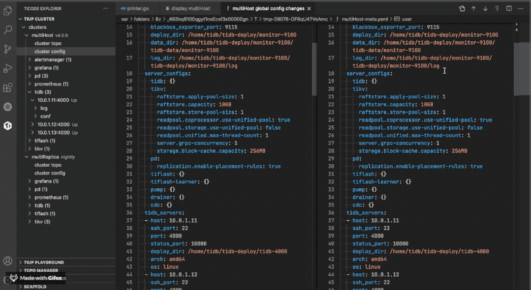 TiDB 作为分布式系统,在分布式环境下进行远程开发也是很多场景下必不可少的能力。TiDE 提供了针对远程集群的一系列能力封装,包括集群启停,修改配置,替换本地编译的二进制到远端节点,查看日志,一键 SSH 到远程节点等操作。