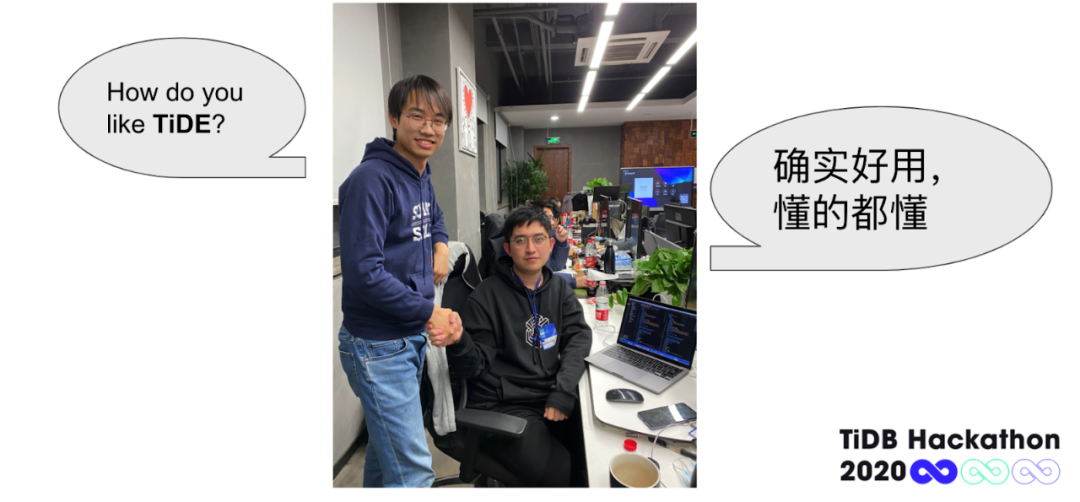 项目开发的过程运用了边开发边推广策略,团队成员也表示参赛意图之一就是为了推广 TiDE,从而得到更多种子用户的反馈,再进而优化功能,在这其中也发生了几件意想不到的趣事。在 Hackathon 比赛现场,有一位友 team 的开发者遇到了 TiUP 的使用困难,在小龙的热心帮助下,使用 TiDE 解决了 TiUP 部署的权限问题,意外当场收获用户一枚,这位开发者在试用 TiDE 后不禁发出了感叹“TiDE 能提升我的开发效率,解放我的思路,确实好用,懂的都懂。”