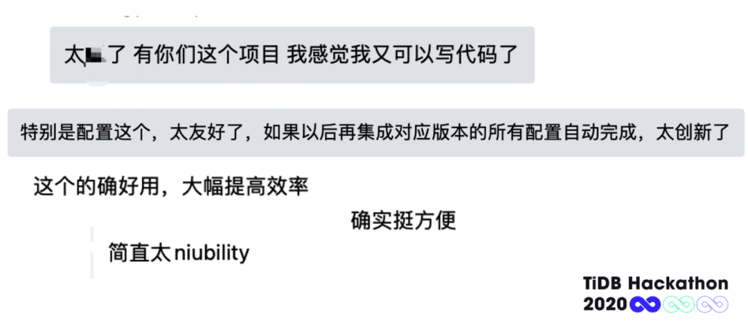 几位成员还在项目答辩前将初版 Demo 给几位同事小小的剧透了一下,没想到把大家都震惊住了,直呼「这也太爽了吧!」,并且立即开始向团队成员提需求“诶,这个重启能不能支持一下只重启单个实例或单个组件呀?”,“诶,bench 功能能不能支持一下呢?”嗯,很合理,可以有,加到 TODO 里!看到大家的认可,B.A.D 的三位同学都表示非常开心,因为他们看到自己的项目确实是有价值的,做一个造福所有 TiDB 开发者的项目真的太有成就感了!