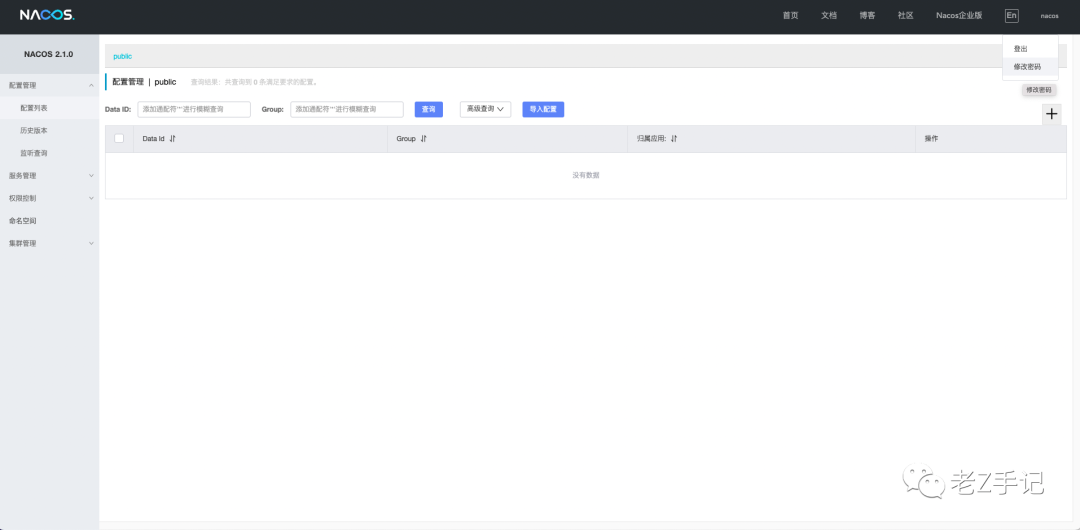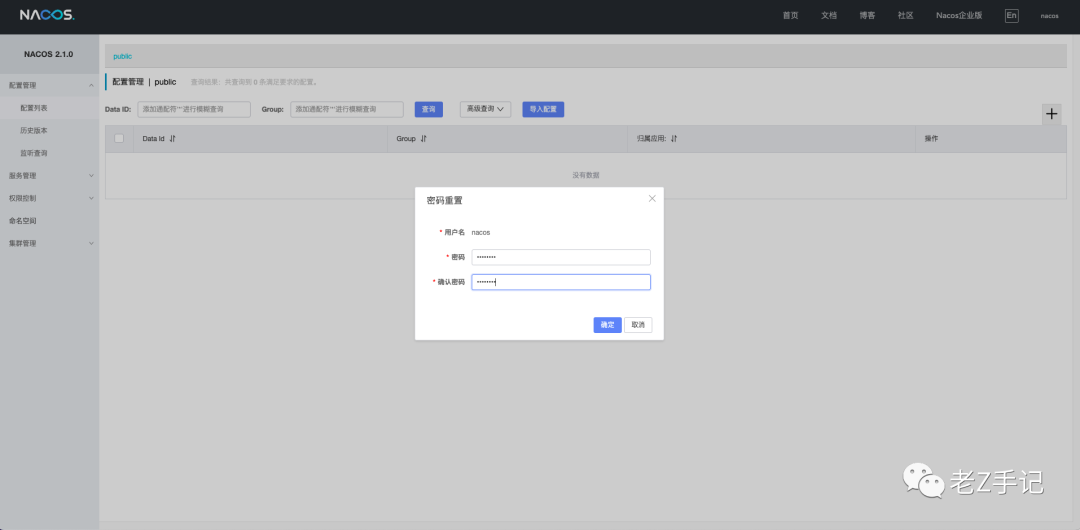 在浏览器中输入 http:// 任意节点 IP:30848,输入默认的用户名和密码,nacos。