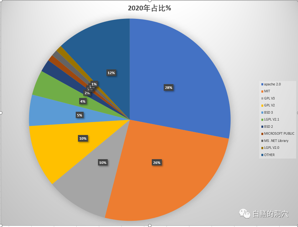 昨天老白看到了一篇whitesource网站上的关于开源软件在开源协议方面2020年的情况分析的文章。列出了2020年TOP 10开源软件协议在开源协议中的占比情况。