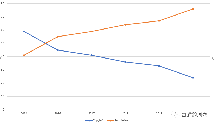 现在开源社区存在的这两种阵营中,Copyleft支持者关注确保他们的工作对每个人都可用,并且希望开源代码的受益者如果想获得商业利益,那么他们必须同时对这个开源软件做出贡献,也就是开源自己的修改。他们认为唯有如此才能确保开源项目以健康的模式发展下去。基于此,Copyleft阵营的GPL许可协议族目前仍然在开源社区广受欢迎。但是,宽松许可的拥护者的立场类似于社会自由主义者的立场。对他们来说,许可限制意味着GPL根本不是免费的许可。虽然“ copyleft”这个名称是为了暗示传统版权的一种替代。宽松许可的支持者认为,copyleft许可只是用另一组限制代替了另一组限制,即使copyleft限制比Copyright版权限制要温和得多。Copyleft支持者关心的是保留对其创建内容的某些控制,并让软件在这种控制下继续开源下去,而宽容的支持者只是想看到他们的软件尽可能广泛地使用。从这些年copyleft开源许可和Permissive开源许可的发展中,我们可以看到这样两条曲线: