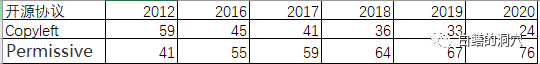 whitesource发布的开源协议2020年数据该数据是基于whitesource数据库中超过4百万个开源软件包,超过130万个开源软件文件的统计得出的。从上面的数据可以看出,apache 2.0和MIT这两个Permissive开源许可排TOP 2的位置,总的占比超过50%。这在十年前是不可思议的,2012年的时候,GPL家族的开源许可协议还占据着主导的位置。