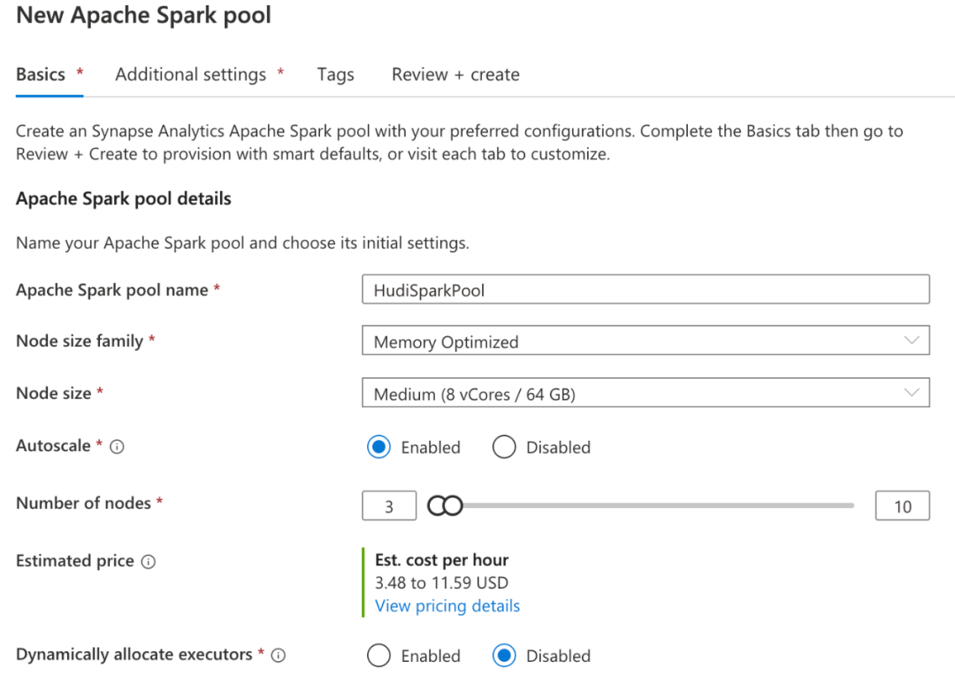 将 Hudi 与 Apache Spark 一起使用非常容易,因此让我们创建一个 Synapse Serverless Spark池,我们可以使用它来读取和写入数据。首先打开刚刚创建的 Synapse Workspace 并在 Synapse Studio 中启动它。按照此快速入门创建 Spark 池[9]。您无需为 Hudi 设置特定设置,但请注意您选择的 Spark 运行时版本,并确保您选择了合适的 Hudi 版本[10]来匹配。在本教程中,我选择了使用 Scala 2.12.10 和 Java 1.8 的 Synapse 中的 Spark 3.1。