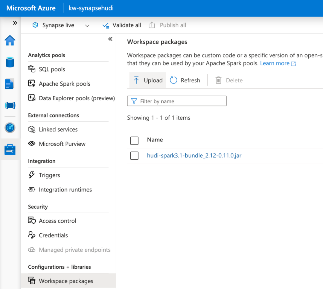 虽然 Apache Hudi 库默认预装在 AWS 和 GCP 上的大多数其他数据服务上,但您需要执行一个额外步骤才能在 Azure 上运行 Hudi。有关如何将包安装到 Synapse 工作区的信息,请参阅文档[11]。使用 Spark 3.1可以配套使用 Hudi 0.10+,可以从 Maven 中心下载了最新的 Hudi 0.11.1 jar:https://search.maven.org/search?q=a:hudi-spark3.1-bundle_2.12 从此处的工作区将 .jar 包上传到 Synapse 工作区: