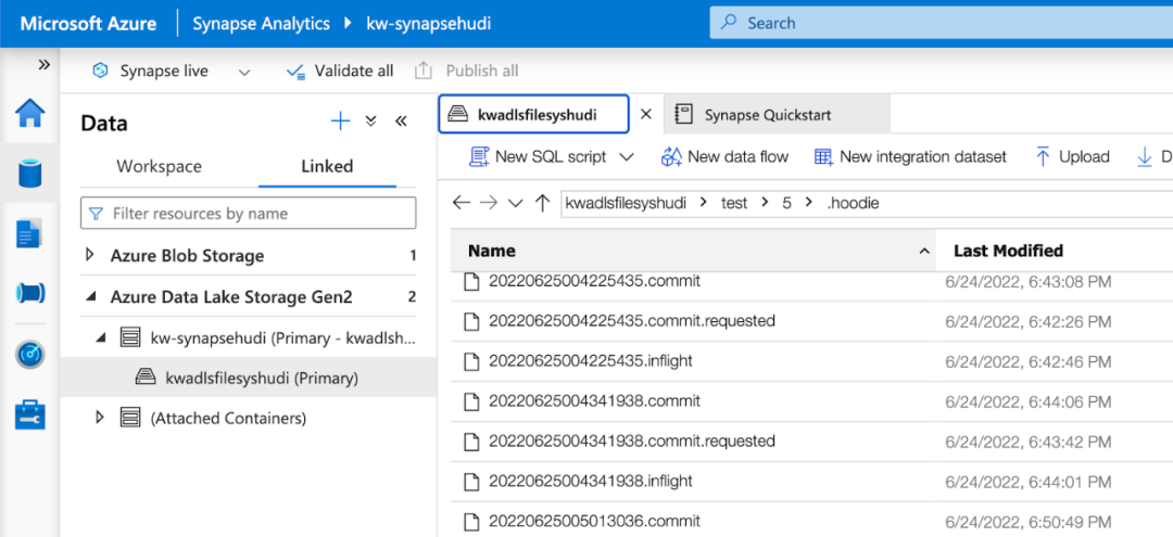 使用 Apache Hudi可以编写时间旅行查询来重现数据集在某个时间点的样子。可以使用提交瞬间或时间戳指定时间点:https://hudi.apache.org/docs/quick-start-guide#time-travel-query 有几种方法可以找到提交瞬间(查询表详细信息、使用 Hudi CLI 或检查存储)。为简单起见我在 Synapse Studio 中打开了 ADLS 浏览器并导航到保存我的数据的文件夹。该文件夹中有一个 .hoodie 文件夹,其中包含以 [commit instance id].commit 表示的提交列表。下面例子选择了最早的一个。