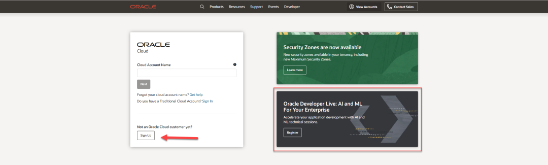 您可以通过cloud.orale.com申请300美金的试用账号,在该页面的右侧就可以看到我们本次活动的链接,可以点击Register进行注册。
