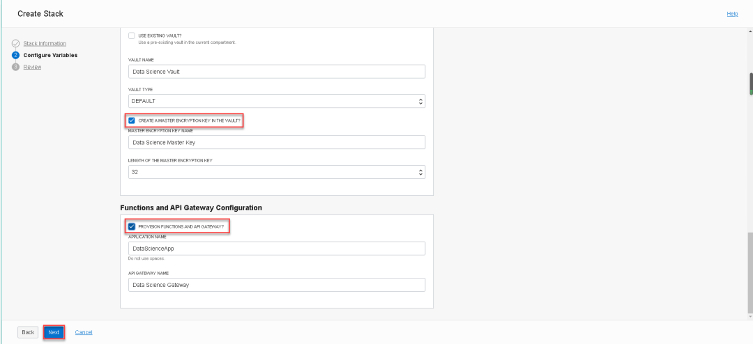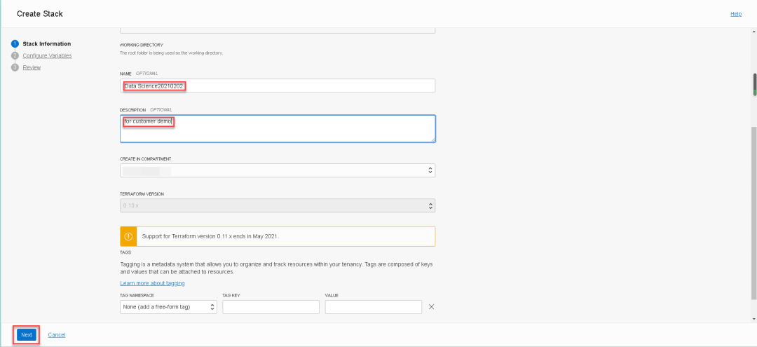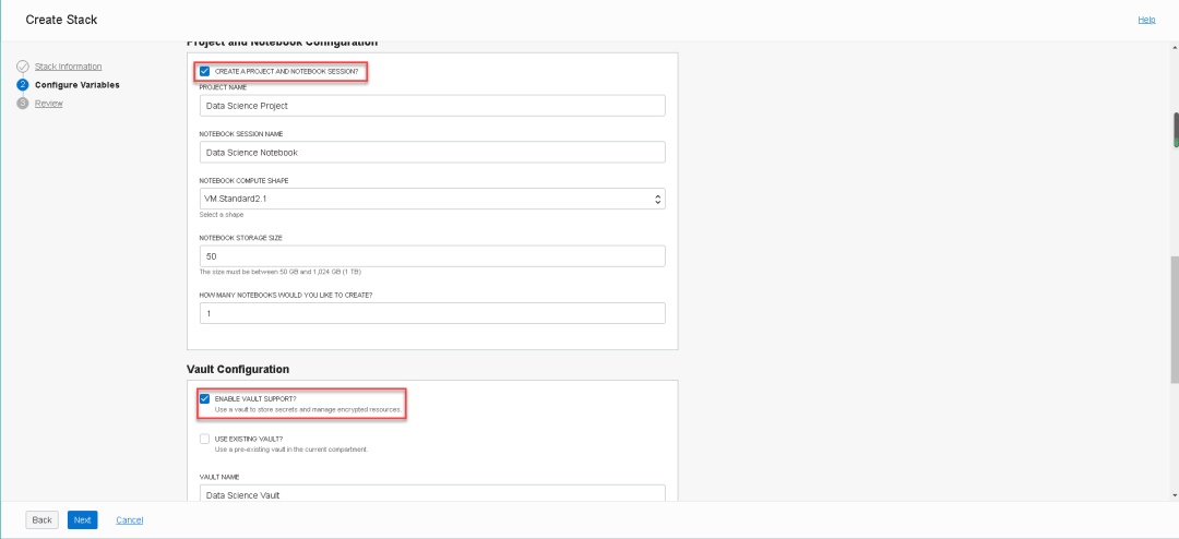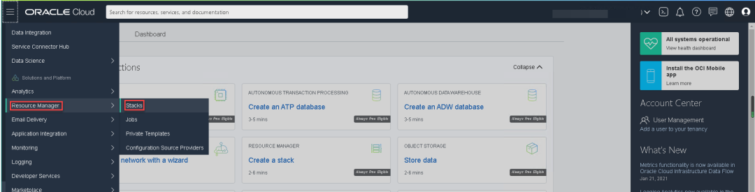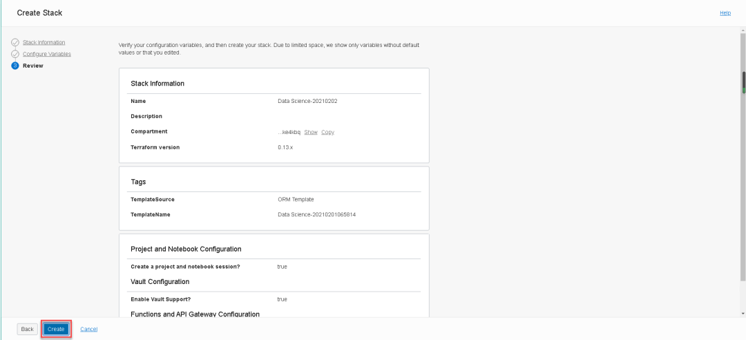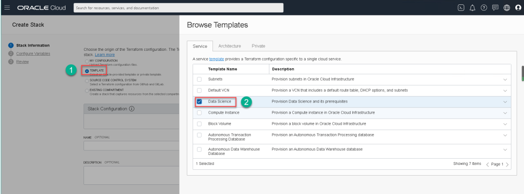为了方便大家搭建环境,我们在OCI当中的资源管理当中,为大家创建了针对数据科学的stack。只需按照如下图所示,就可以轻松创建Oracle数据科学环境。
