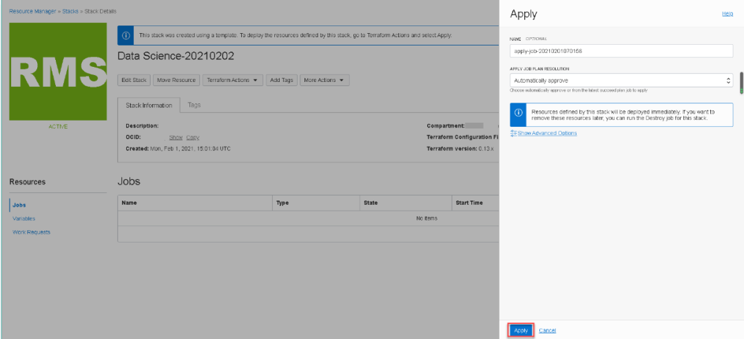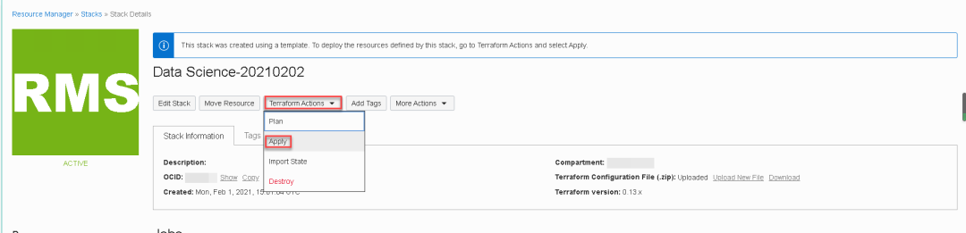 stack创建后,在Terraform Actions当中选择apply进行应用。