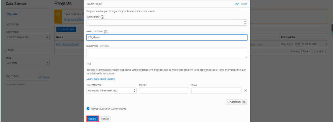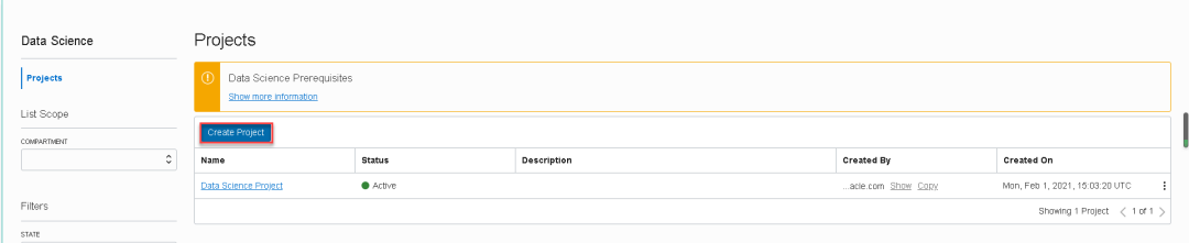 Oracle Data Science是在Notebook当中运行分析程序的,我们首先创建Project。