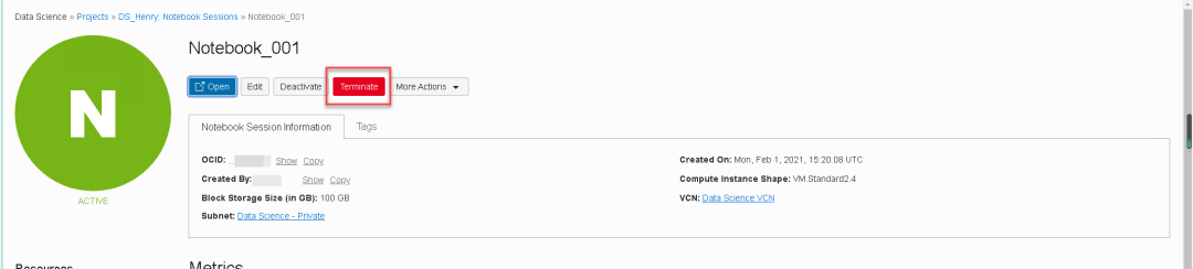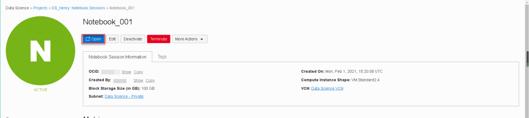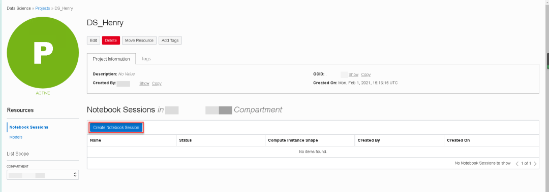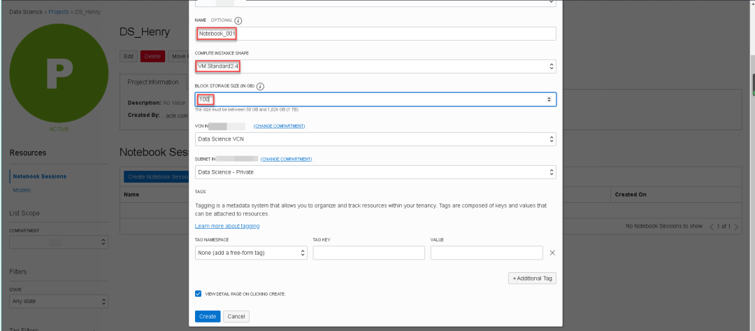 在Project创建完毕之后,创建notebook session。这将创建一个OCI上的虚拟机实例。