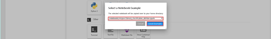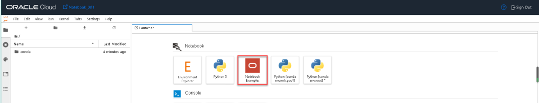 当安装过程结束,点击下图中红色框标记的Notebook Examples载入我们的实验脚本。
