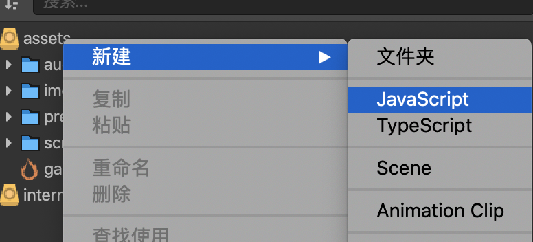 项目初始化之后,在左下角资源管理器新建一个游戏 Scene,取名 game 作为游戏主场景。