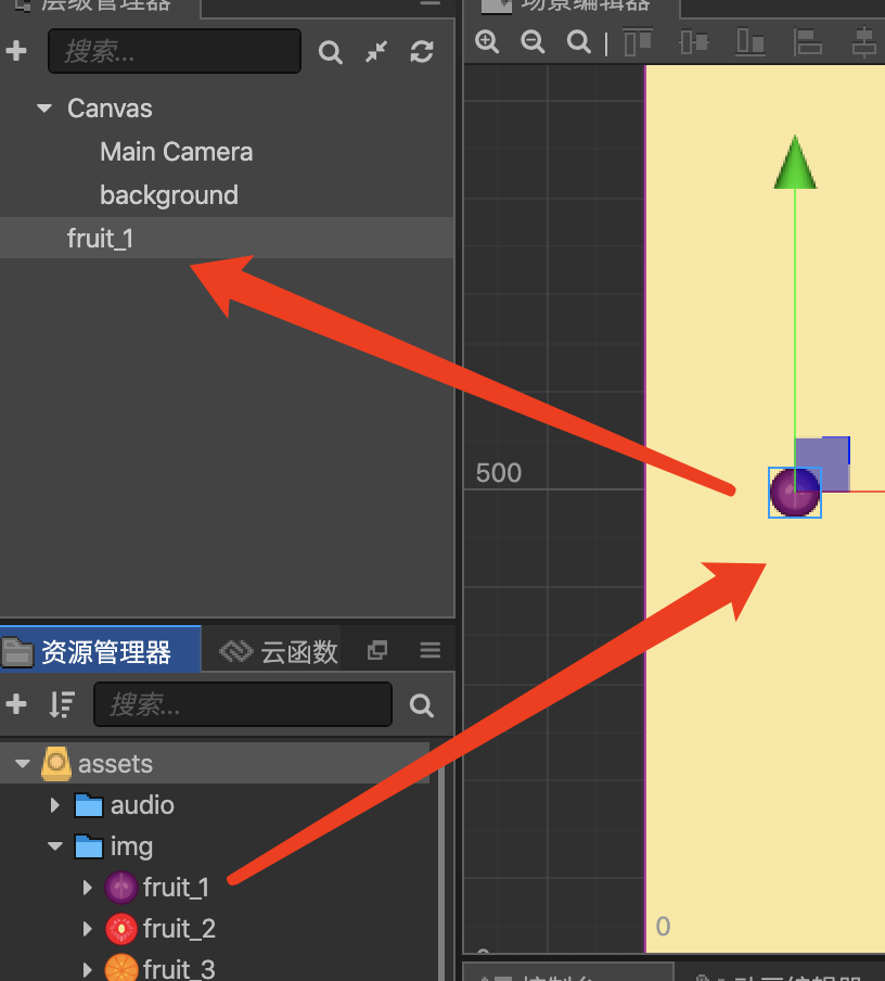 然后将层级管理器中的节点删除,这样我们就得到了一个 fruit 的预制资源,在脚本组件中,就可以使用代码通过预制资源动态生成节点了。