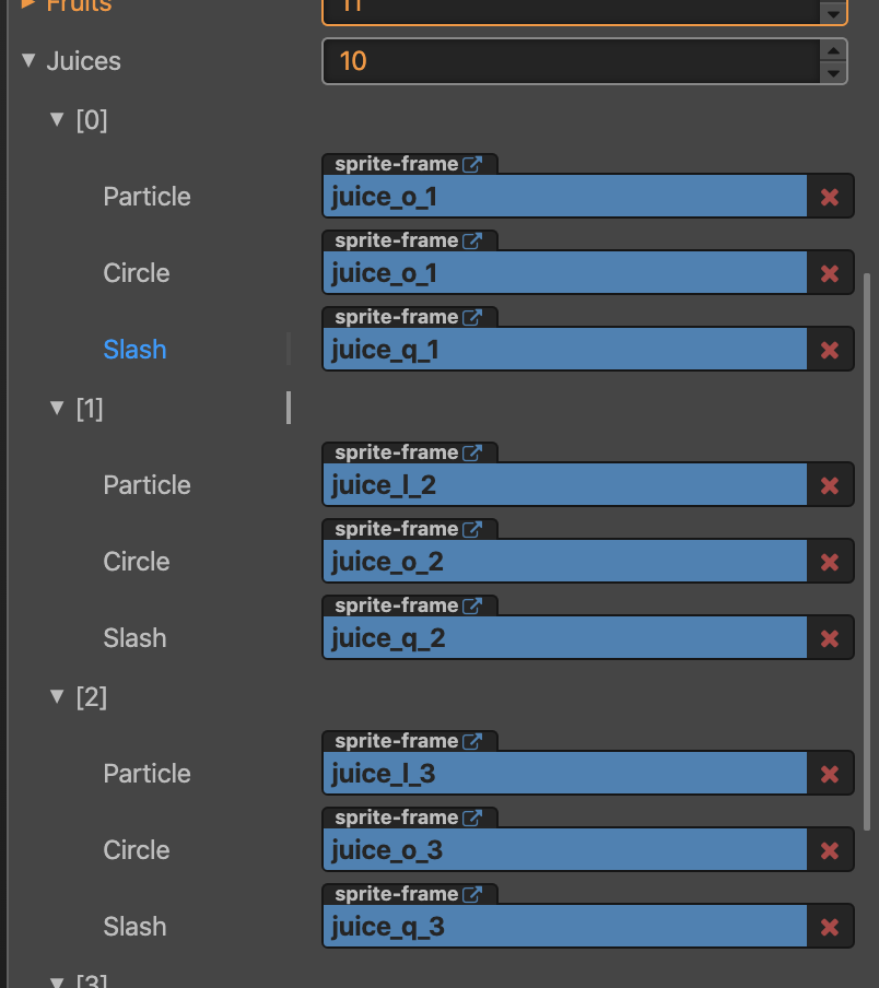 // Game.jsconst JuiceItem = cc.Class({ name: 'JuiceItem', properties: { particle: cc.SpriteFrame, // 果粒 circle: cc.SpriteFrame, // 水珠 slash: cc.SpriteFrame, // 果汁 }});
