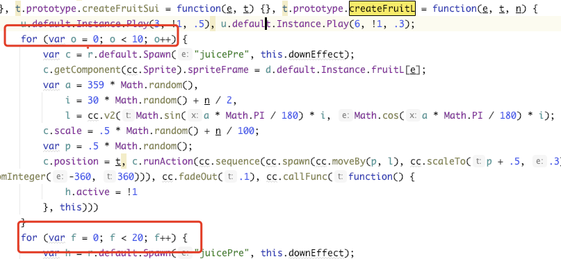 showJuice(pos, width) { // 果粒 for (let i = 0; i < 10; ++i) { const node = new cc.Node('Sprite'); const sp = node.addComponent(cc.Sprite); sp.spriteFrame = this.particle; node.parent = this.node; // ... 一堆随机的参数 node.position = pos; node.runAction( cc.sequence( // ...各种action对应的动画逻辑 cc.callFunc(function () { // 动画结束后消除粒子 node.active = false }, this)) ) } // 水珠 for (let f = 0; f < 20; f++) { // 同果粒,使用的spriteFrame切换成 this.circle } // 果汁只有一张贴图,使用this.slash,展示常规的action缩放和透明动画即可},