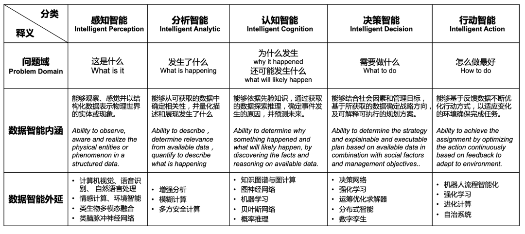 感知智能:主要研究机器能否观测物理世界“是什么”的问题; 分析智能:主要研究机器能否呈现物理世界“发生了什么”的问题; 认知智能:主要研究机器能否理解物理世界“为什么发生”和预测“还可能发生什么”的问题; 决策智能:主要研究机器能否帮助解决“应该做什么”的问题;