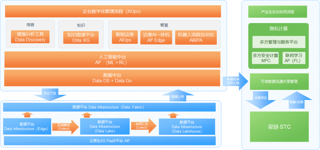 亚信科技基于上述分类体系,确立了自身数据智能产品体系,推动数据价值“变现”。数据基础设施平台基于储算分离原则,适配从边缘到云端的云原生5G PaaS平台,为企业提供数据湖与湖仓一体化管理、多集群与多租户管控能力,同时具备面向算力网络的数据编织能力,协助客户打造高效、安全的企业级分布式大数据基础平台。数据中台操作系统面向数据集成、处理、治理、安全、共享等,提供全生命周期的“管家”式服务,助力企业以数据驱动业务创新和增长。通用人工智能平台是智慧中台的中枢,提供算法模型分步构建、全生命周期管理服务,以及强场景、低成本、软硬一体的解决方案和标准化AI应用。数据探索分析平台是敏捷开放、支持海量数据分析与可视化的工具,提供丰富的可视化和简易拖拽式操作功能,能集成多种数据分析算法,帮助企业快速构建数据可视化分析体系,实现智能决策。知识图谱工具是基于“大数据+AI”的一站式全流程知识计算平台,提供涵盖知识本体构建、知识抽取与融合、知识推理和应用等在内的全栈核心能力,帮助客户构建知识图谱和快速应用。 边缘智能