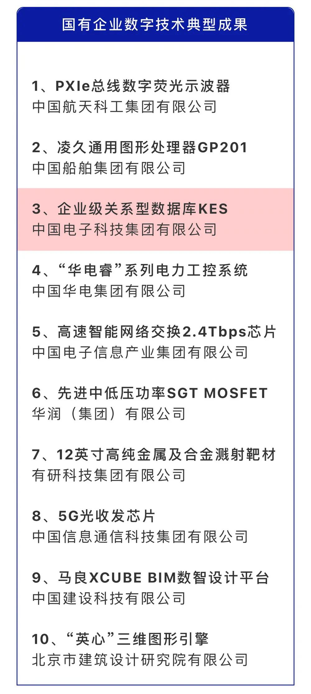 论坛上,国务院国资委发布十项国有企业数字技术典型成果。中国电子科技集团有限公司所属北京人大金仓信息技术股份有限公司自主研发的“企业级关系型数据库KES”荣耀入选。