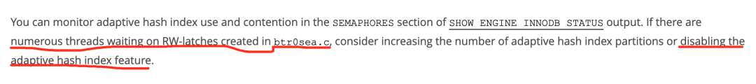 另,如果show engine innodb status 信号量那块里面有大量RW-latches created in btr0sea.c 的信息,则表明AHI 影响性能了。可以考虑关闭或者调整参数 innodb_adaptive_hash_index_parts,该参数默认为8。