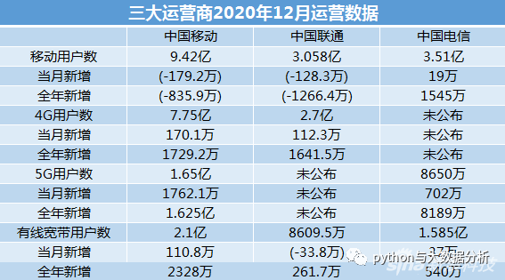 下图为三大运营商2020年12月的运营数据,可以看到中国移动在移动用户数、4G用户数、5G用户数占据绝对优势,有线宽带用户数也是移动占据优势,中国联通在三大运营商中各方面均处于下风。