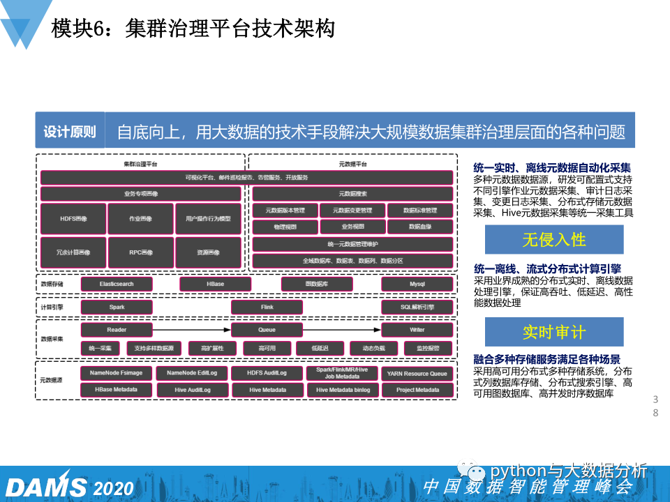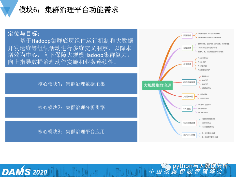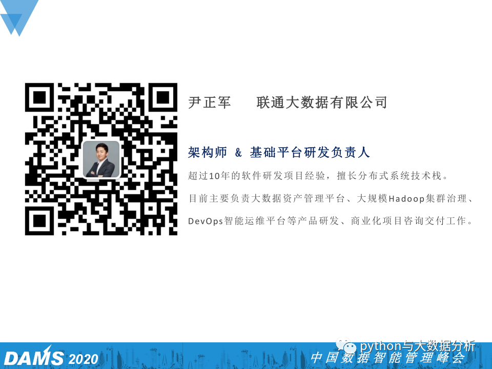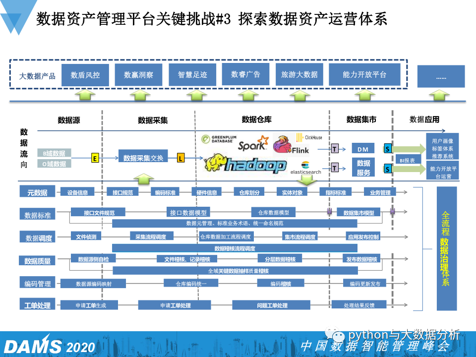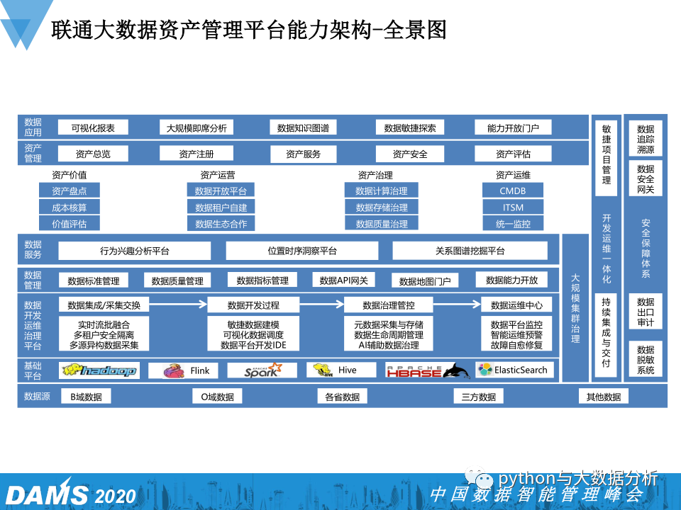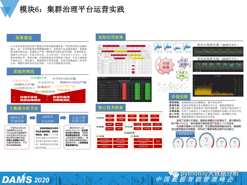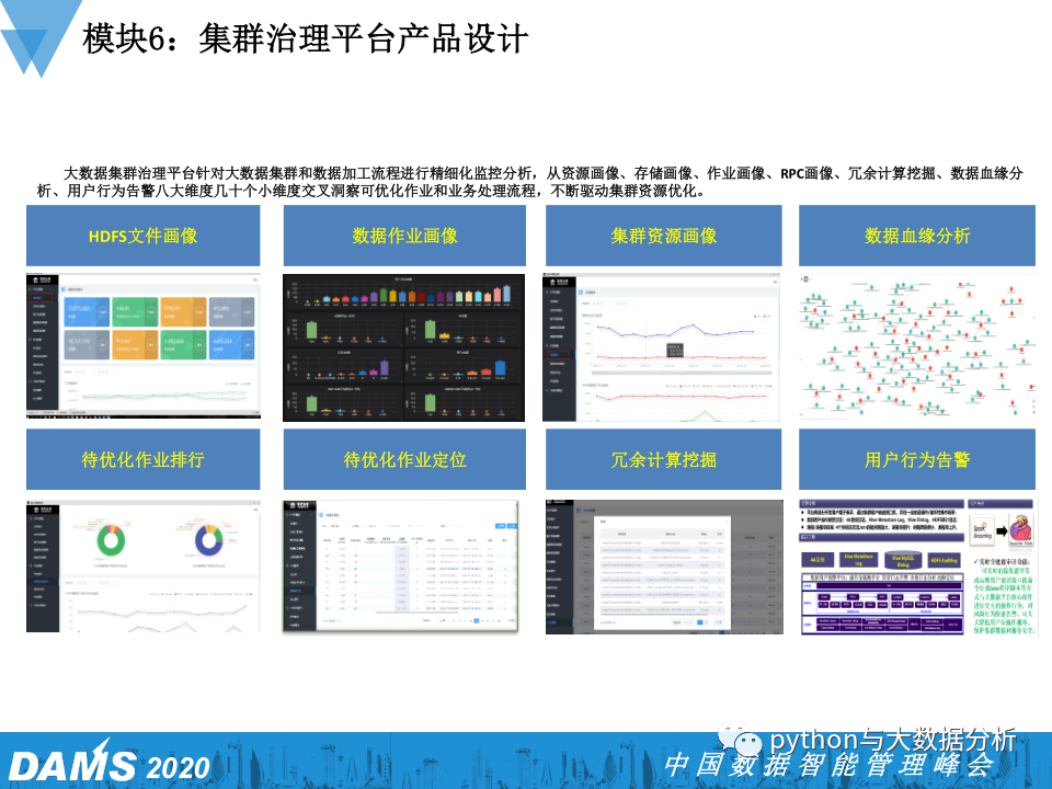 回到正题上,中国联通在DAMS中国数据智能管理峰会上做了大数据资产管理平台设计与研发实践的分享,三大运营商在大数据平台建设、数据资产管理上在业界还是做的不错的,在数据资产管理上,联通提到的集群治理平台产品还是值得借鉴的,定位上基于Hadoop集群底层组件运行机制和大数据开发运维等组织活动进行多维交叉洞察,以降本增效为中心,向下保障大规模Hadoop集群算力,向上指导数据治理动作实施和业务连续性。原则是自底向上,用大数据的技术手段解决大规模数据集群治理层面的各种问题,大数据集群治理平台针对大数据集群和数据加工流程进行精细化监控分析,从资源画像、存储画像、作业画像、RPC 画像、冗余计算挖掘、数据血缘分析、用户行为告警八大维度几十个小维度交叉洞察可优化作业和业务处理流程,不断驱动集群资源优化。