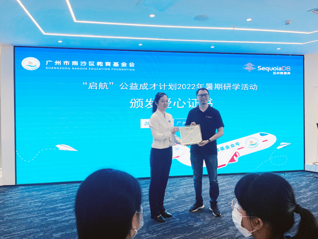 最后,基金会秘书长钟星为巨杉数据库颁发爱心证书,对巨杉数据库作为本地优质企业积极参与教育公益事业的社会担当表示认可与肯定。