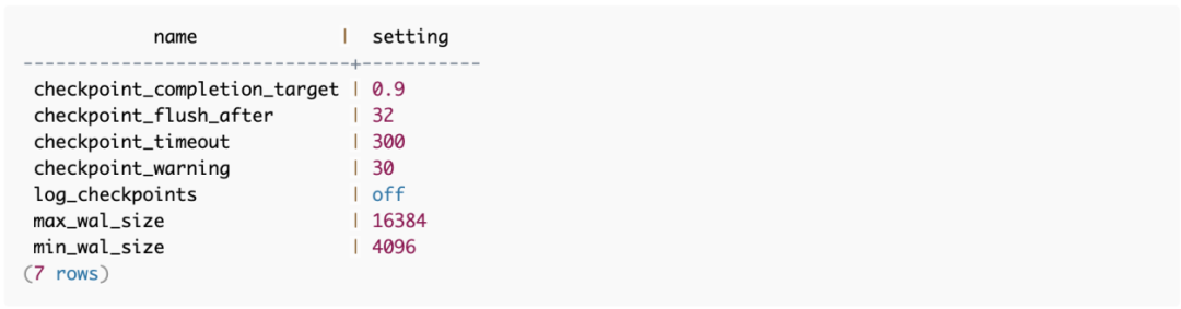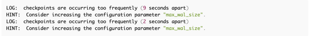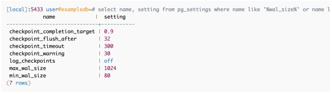 首先,看一下系统设置,简单讨论一下这个错误的含义。Postgres日志中提到了两个具体的东西,checkpoints和max_wal_size。查看Postgres实例是否有与这两个项目相关的设置,我们看到以下内容。