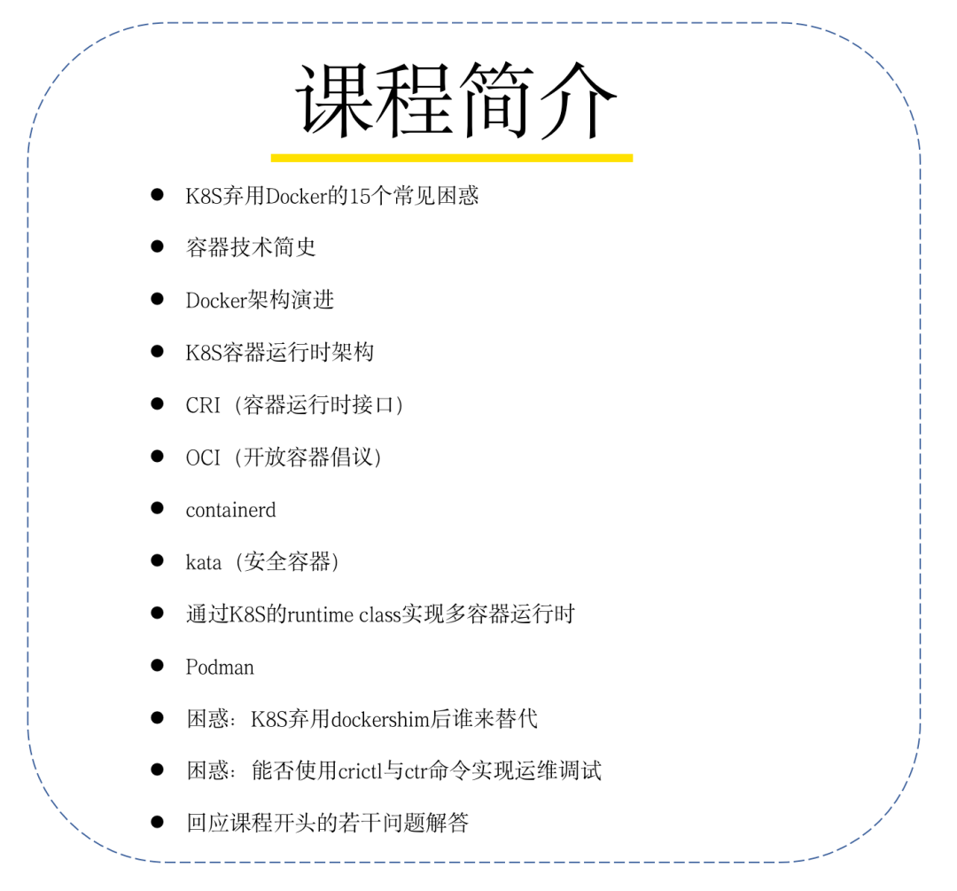 为了真正理清楚K8S容器运行时,我进行了知识的梳理,并以视频形式提供了完整内容:从Docker历史出发,逐步讲解K8S容器运行时的架构,并深入CRI、OCI、containerd、kata、podman、runtimeclass(多容器运行时),涵盖了数十个术语的解析,以及实践踩坑。