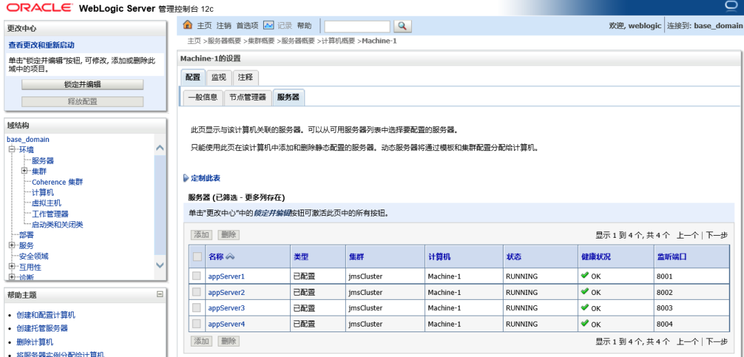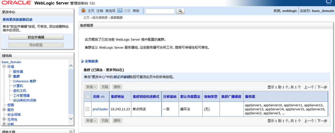 搭建OracleJMS消息中间件,前提我们得预先部署一套weblogicserver集群,搭建weblogic集群的方案,绝大部分中间件同时应该已经驾轻就熟了,篇幅关系,再次不做详细赘述。Weblogic集群信息如下所述。