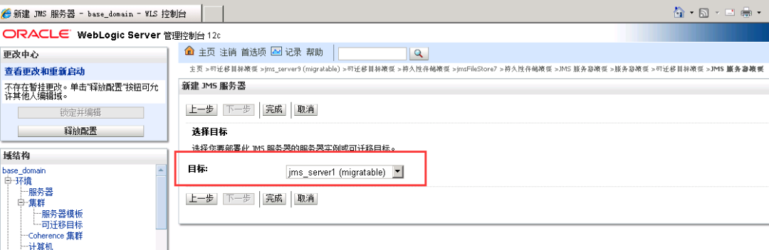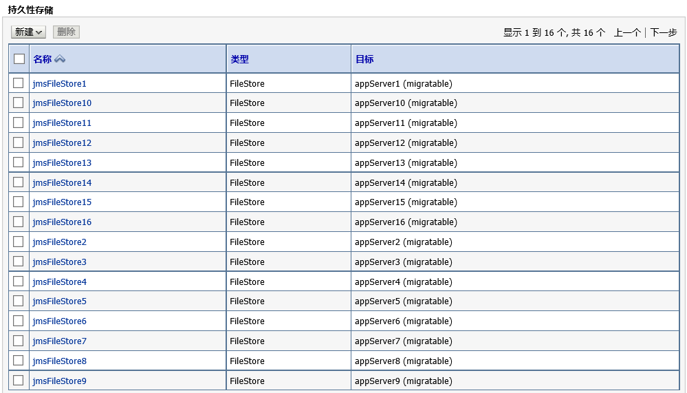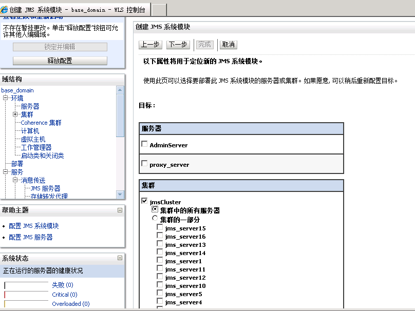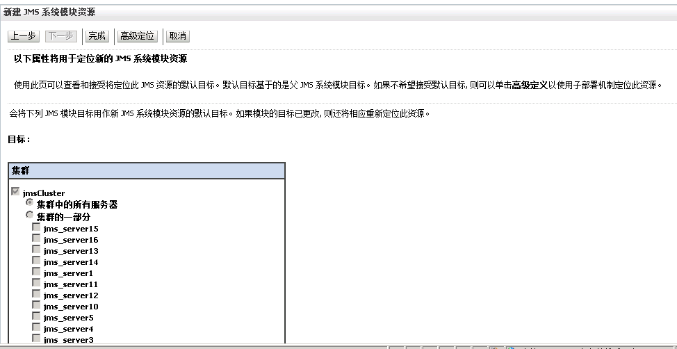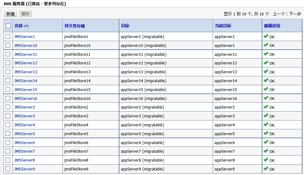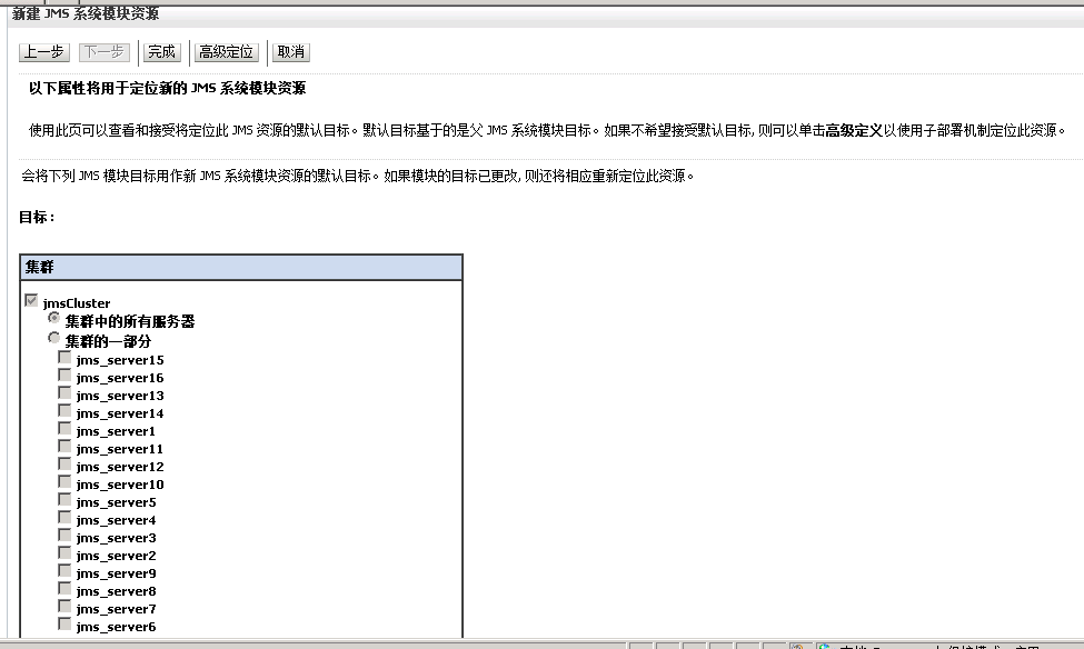 目标和上一步选择的持久性存储的目标要一致。点击完成,激活更改。本案例共创建16个JMS服务器,如下图: