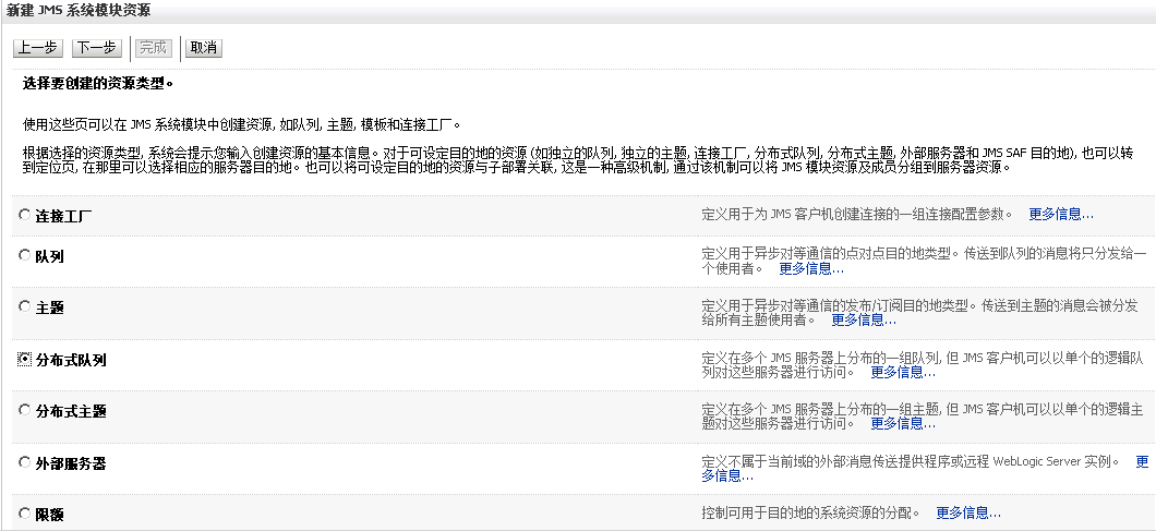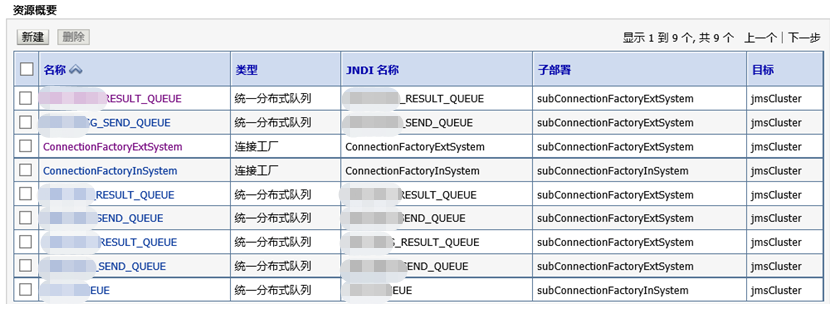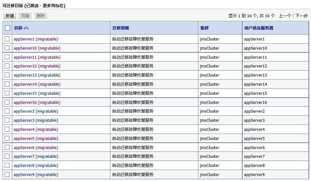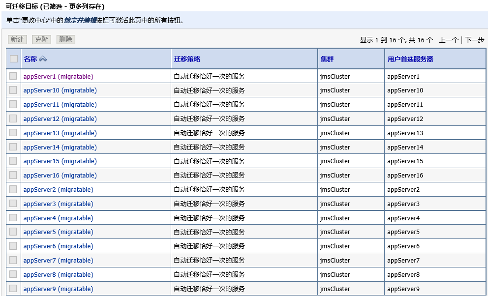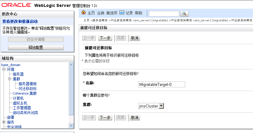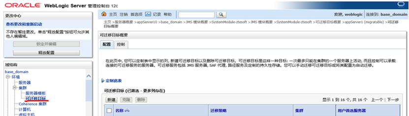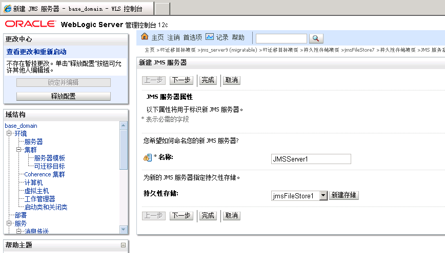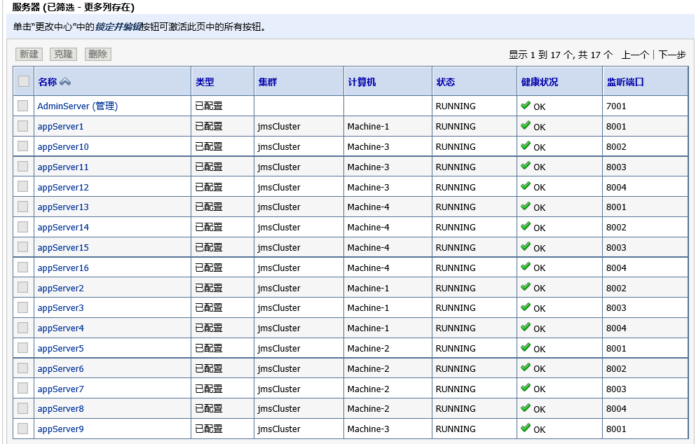 目标和上一步选择的持久性存储的目标要一致。点击完成,激活更改。本案例共创建16个JMS服务器,如下图: