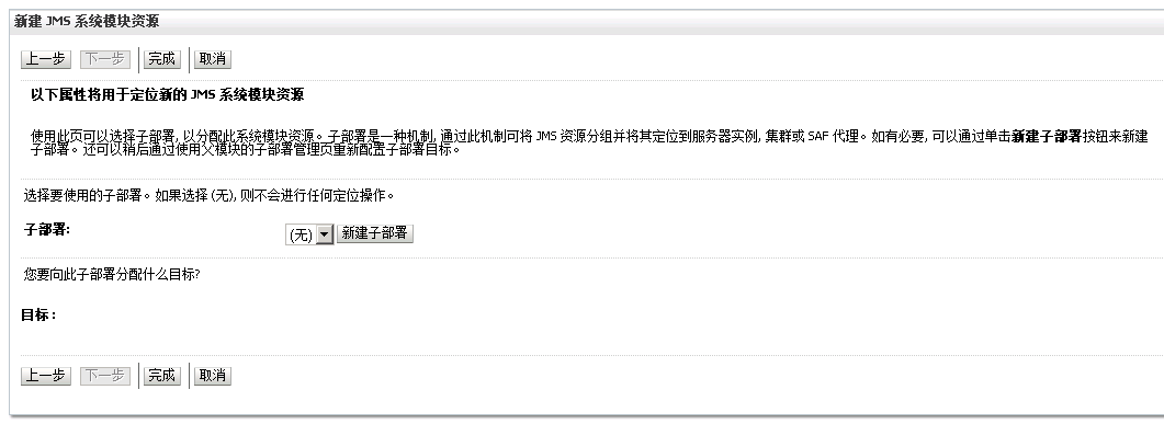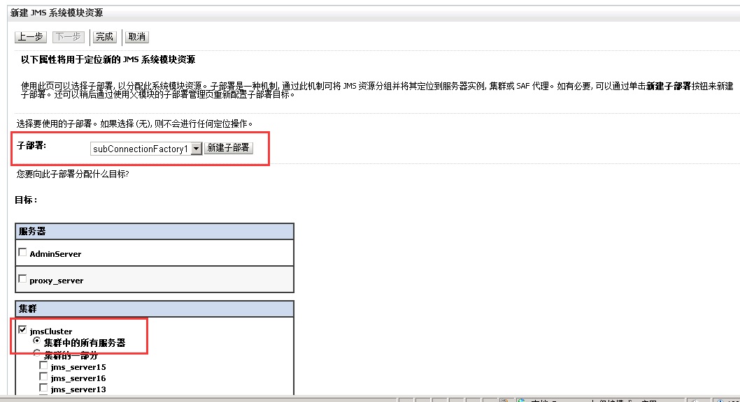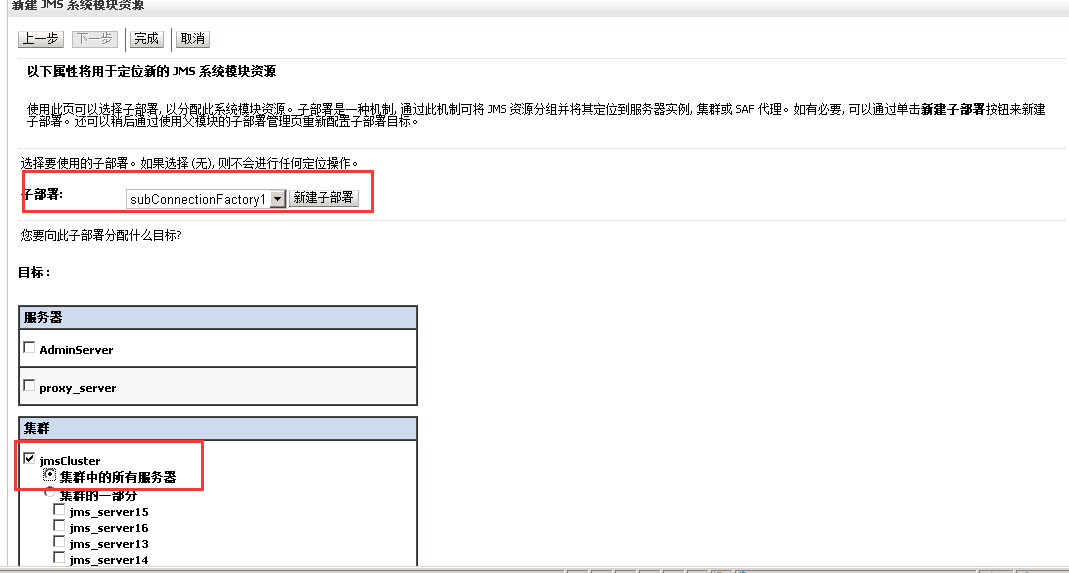 子部署选择连接工厂中创建的子部署,目标选择集群中所有服务器。点击完成,激活更改。