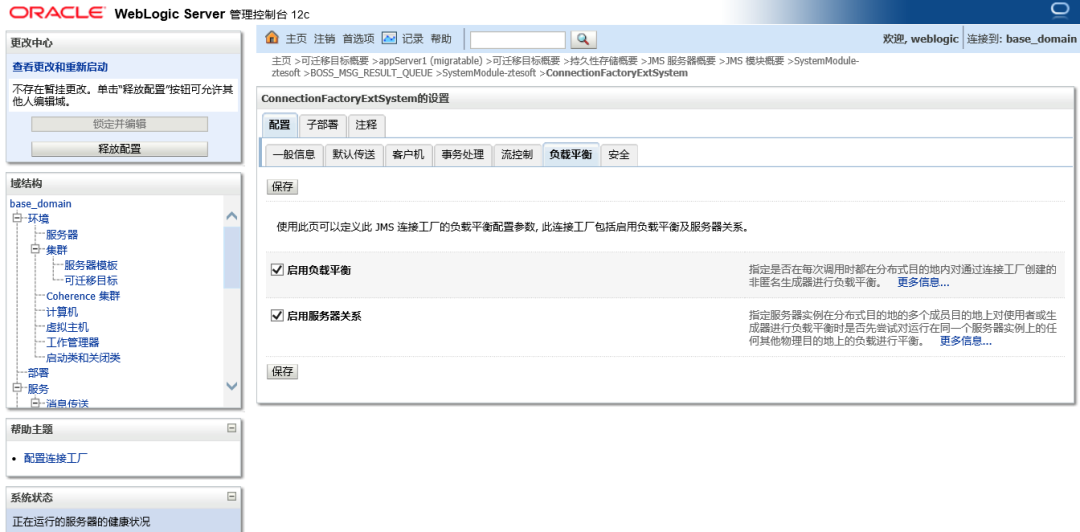 点击服务->消息传送->JMS模块->SystemModule1,进入JMS模块设置界面,点击连接工厂ConnectionFactoryExtSystem,打开连接工厂配置界面。点击配置->负载均衡标签页,设置启动负载平衡。