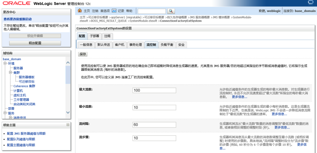 点击服务->消息传送->JMS模块->SystemModule1,进入JMS模块设置界面,点击连接工厂ConnectionFactory1,打开连接工厂配置界面。点击配置->流控制标签页,设置单个连接的最大写入速度。