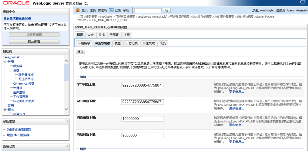 点击服务->消息传送->JMS模块->SystemModule1,进入JMS模块设置界面,点击分布式队列BOSS_MSG_RESULT_QUEUE,打开分布式队列配置界面。点击阈值和限额标签页,设置消息阈值上限和消息阈值下限