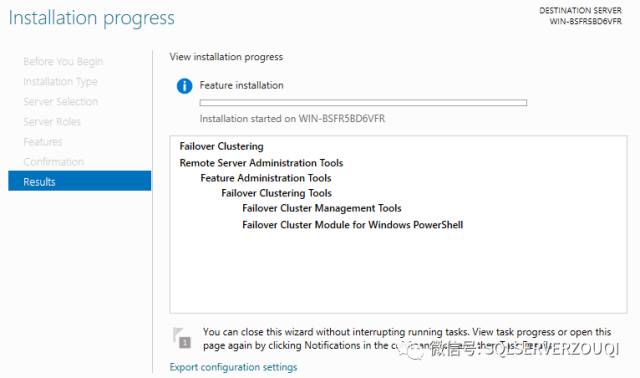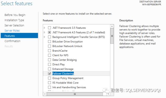 集群的每个结点服务器都必须在同一域中,并且都安装了Windows Server Failover Clustering(WSFC)服务,安装的过程十分简单,按照该章节的步骤,只需几步就安装成功。