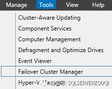 安装Failover Clustering 功能完成之后,打开Server Manager,在菜单Tools中选择“FailOver Cluster Manager”,打开故障转移机器管理器