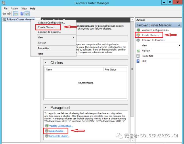 用户在故障转移管理器(Failover Cluster Manager)中,能够对已经创建成功的Failover Cluster进行管理,查看集群的信息,监控集群的状态和验证(Validate)集群的配置等。在截图的标记处,点击Create Cluster,开始创建新的集群。