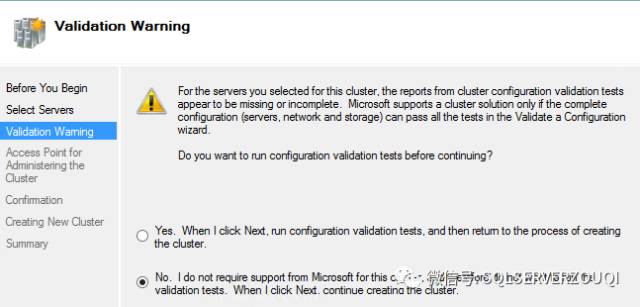 如果需要对集群的基本环境,包括硬件,进行WSFC需求验证,可以选择“Yes”,本例选择“No”,不验证