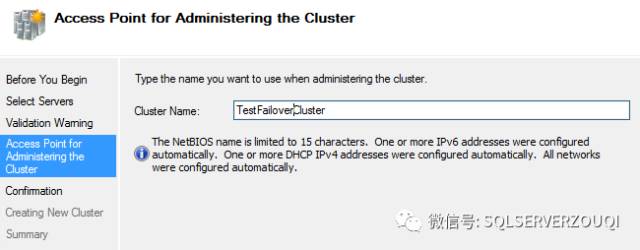 为集群命名,Cluster Name实际上是虚拟服务器的网络名;集群的IP地址由系统自动配置,该IP地址实际上是虚拟服务器的IP地址;