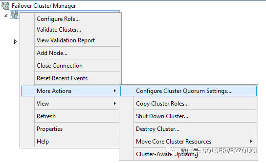 2, 右击群集节点,在上下文菜单中点击“More Actions”,在扩展菜单中选择“Configure Cluster Quorum Settings”为该集群配置仲裁