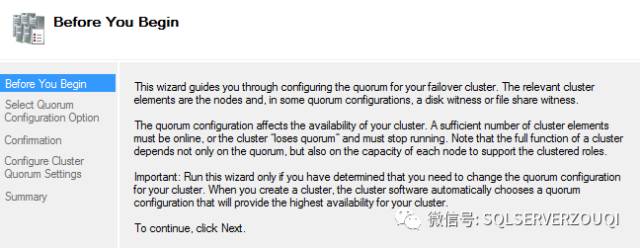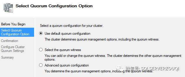 微软推荐配置一个Quorum Witness,帮助实现集群的最高可用性,如果对仲裁配置不是很了解的话,可以使用默认选项,由集群决定仲裁配置。