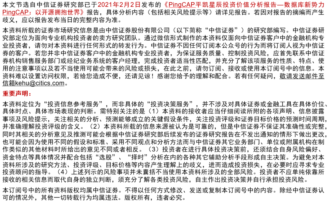 作为全球领先的分布式关系型数据库新势力,PingCAP通过前沿技术消除传统数据库分库分表的困扰,解决数据存储碎片化痛点,打破事务数据处理和大数据分析的界限,使开发人员能够专注于应用本身,减少企业的部署和运维成本。同时,公司充分利用开源生态优势快速迭代产品、构筑人才高地、建立生态合作伙伴体系,并将云数据库和开源生态充分结合,满足企业对可扩展性和高灵活性的需求,加速企业数字化转型与升级。长期而言,公司的目标是成为营业收入数十亿美元、市值五百亿美元以上的全球数据库巨头。我们认为公司具备这样的潜力,推荐投资者长期重点关注。