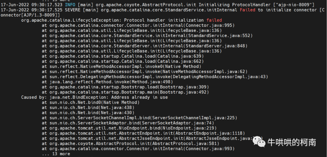 17-Jun-2022 09:30:17.525 SEVERE [main] org.apache.catalina.core.StandardService.initInternal Failed to initialize connector [Connector[AJP/1.3-8009]]