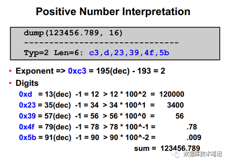 正数:exponent = first byte - 128 - 65(offset) = first byte - 193