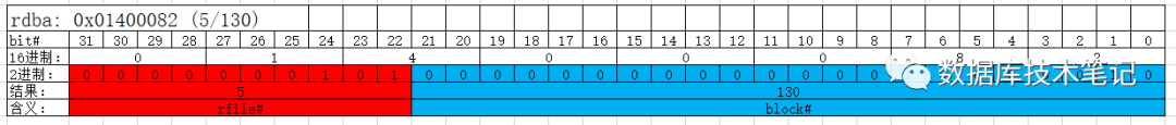 6、 rdba由4 bytes组成,共32 bits,offset 22~31(10 bits)表示 RFILE#,offset 0~21(22 bits)表示:block#;