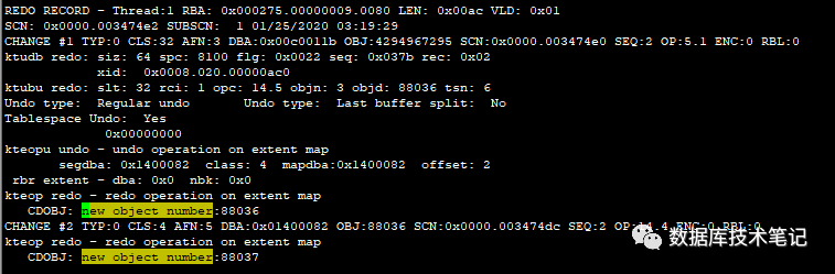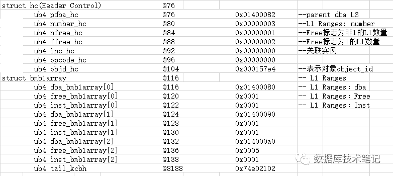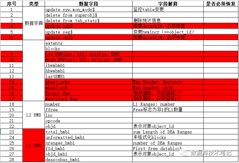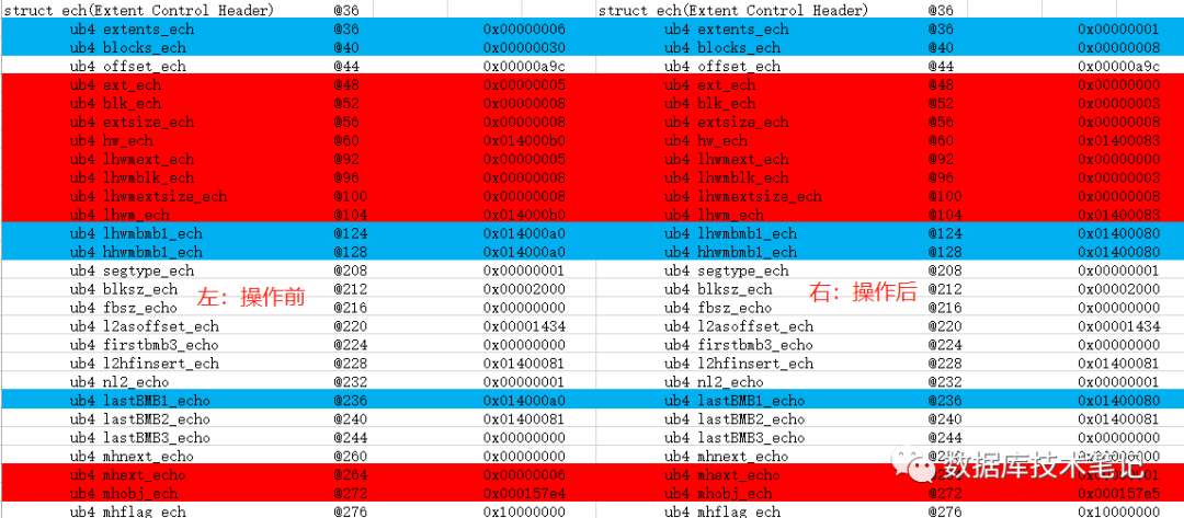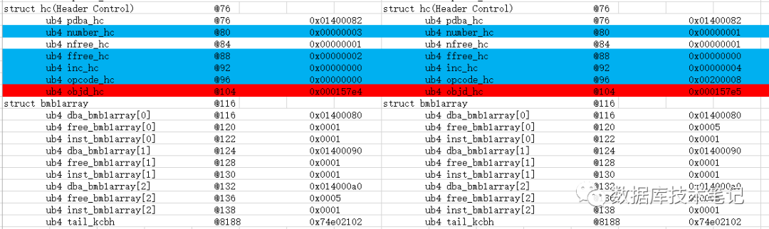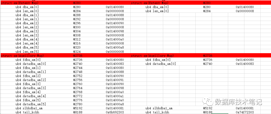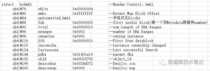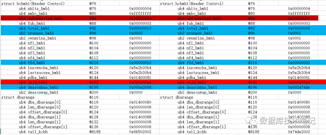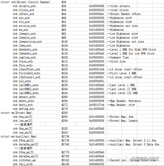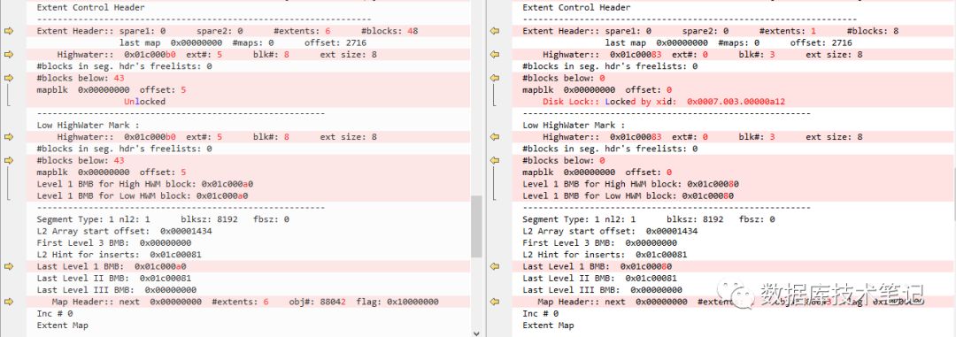segment header变更信息:extents、blocks、ext、blk_ech、extsize_ech、hw、lhwmext、lhwmblk、lhwmextsize、lhwm、lhwmbmb1、hhwmbmb1、lastBMB1、mhext_echo、mhobj_ech、Extent Map(只保留第一个)、AuxillaryMap(只保留第一个)