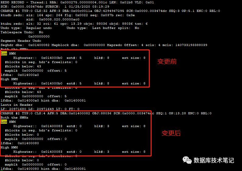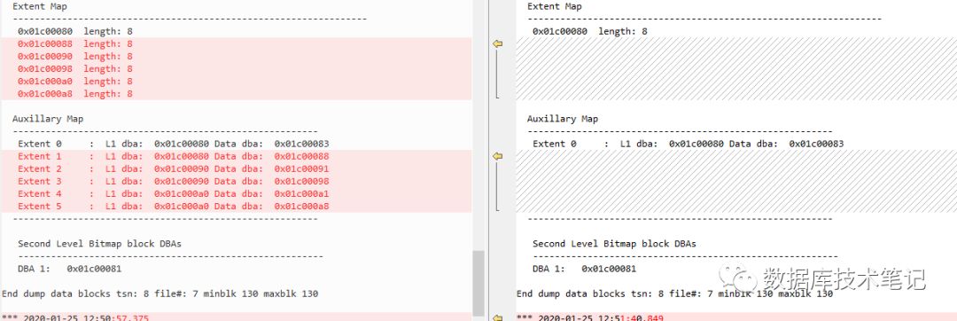 该步骤通过Oracle dump工具对操作前后的segment header内容进行对比,验证上面的结果。