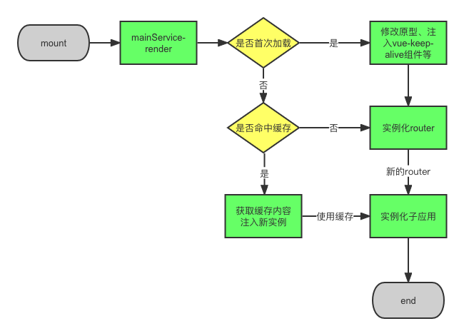// 实例化子应用vue-routerfunction initRouter() {const { router: originRouter } = this.baseConfig;const config = Object.assign(originRouter, {base: `app-kafka/`,});Vue.use(VueRouter);this.router = new VueRouter(config);}// 创建子应用实例,有缓存的vnode则使用缓存的vnodefunction newVueInstance(cachedNode) {const config = {router: this.router, // 在vue init过程中,会重新调用vue-router的init方法,重新启动对popstate事件监听store: this.store,render: cachedNode ? () => cachedNode : instance.render, // 优先使用缓存vnode});return new Vue(config);}function render() {if(isCache) {// 场景一、重新进入应用(有缓存)const cachedInstance = loadedApplicationMap[this.cacheKey];// router使用缓存命中this.router = cachedInstance.$router;// 让当前路由在最初的Vue实例上可用this.router.apps = cachedInstance.catchRoute.apps;// 使用缓存vnode重新实例化子应用const cachedNode = cachedInstance._vnode;this.instance = this.newVueInstance(cachedNode);} else {// 场景二、首次加载子应用/重新进入应用(无缓存)this.initRouter();// 正常实例化this.instance = this.newVueInstance();}}function unmountCache() {// 省略其他代码...cachedInstance.$router = this.instance.$router;cachedInstance.$router.app = null;// 省略其他代码...}